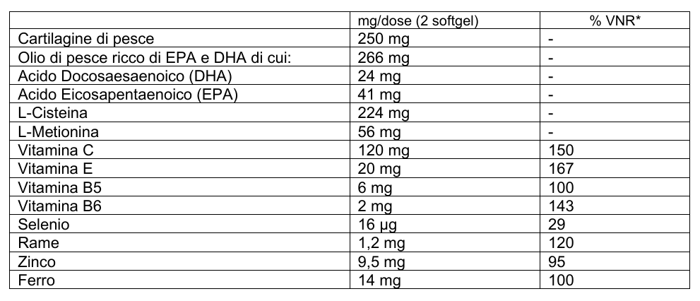 OLIO DI GIRASOLE, INVOLUCRO: GELATINA BOVINA, GLICEROLO (E422), COLORANTI: OSSIDI E IDROSSIDI DI FERRO; OLIO DI PESCE RICCO IN EPA E DHA, CARTILAGINE DI PESCE, L-CISTEINA, VITAMINA C (ACIDO L-ASCORBICO), ADDENSANTE: MONO-E DIGLICERIDI DEGLI ACIDI GRASSI; L-METIONINA, FUMARATO FERROSO, EMULSIONANTE: LECITINA DI GIRASOLE, VITAMINA E (ACETATO DI DL-ALFA TOCOFERILE), OSSIDO DI ZINCO, VITAMINA B5 (D-PANTOTENATO, CALCIO), SOLFATO DI RAME, VITAMINA B6 (CLORIDRATO DI PIRIDOSSINA), SELENITO DI SODIO